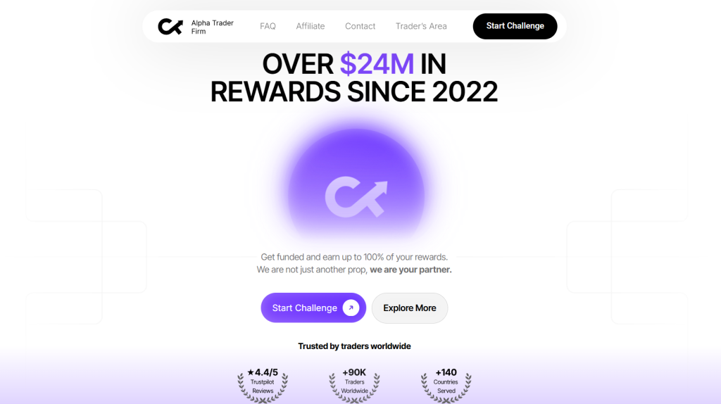 Alpha Trader Firm is a simulation-based prop trading company offering multiple evaluation paths, instant funding options, on-demand payouts, and account scaling. The firm advertises over 24M in rewards since 2022, zero payout denials, and simulated funding opportunities up to 1,000,000.