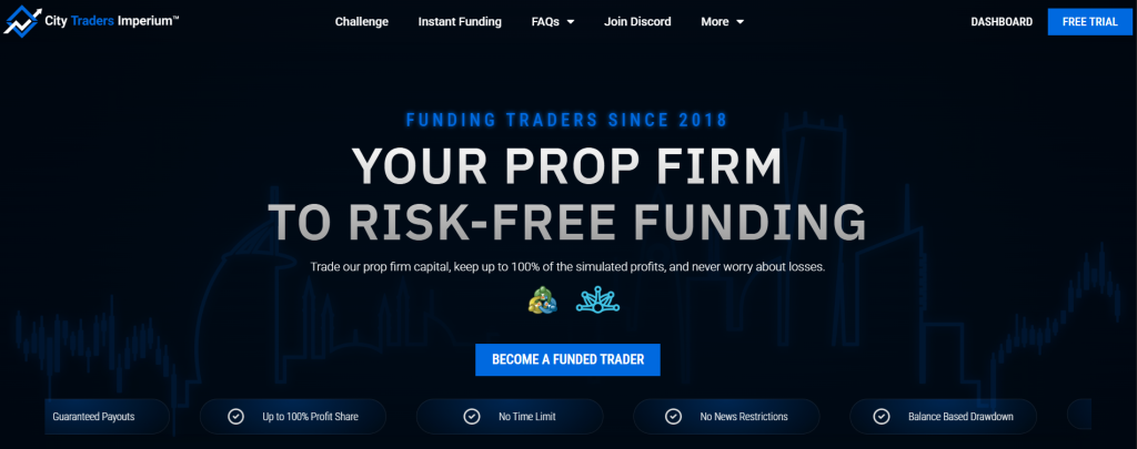 City Traders Imperium (CTI) offers multiple routes—Instant Funding (no evaluation), 1-Step, and 2-Step—aimed at quick progression and scaling. CTI markets “payouts on demand,” profit share up to 100%, and scaling potential into the multi-million range, with instant programs emphasizing absolute (non-trailing) drawdown.