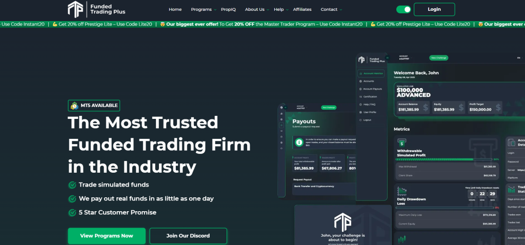 Funded Trading Plus is a simulation-based prop firm best known for its Instant Master program, which advertises “get paid from day 0” and payout splits up to 100%. The Master track also sets explicit profit-threshold rules: after 20% simulated profit you can request a 90/10 split, and at 30% you can upgrade to 100% on withdrawals. Program copy highlights a 6% max / 6% daily trailing simulated loss and no evaluation targets on Instant. These marketing points position the brand for traders who value immediate rewards and simple, published thresholds.