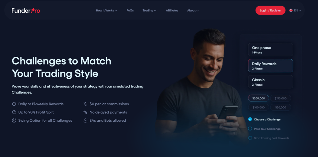 Funder Pro is a prop trading company centered on speed and frequent withdrawals, led by its Daily Rewards funded accounts that let traders claim profits whenever they are at least one percent in profit. Public materials emphasize fast processing with rewards typically issued within one business day and an average issuing time near eight hours, with a split up to ninety ten.