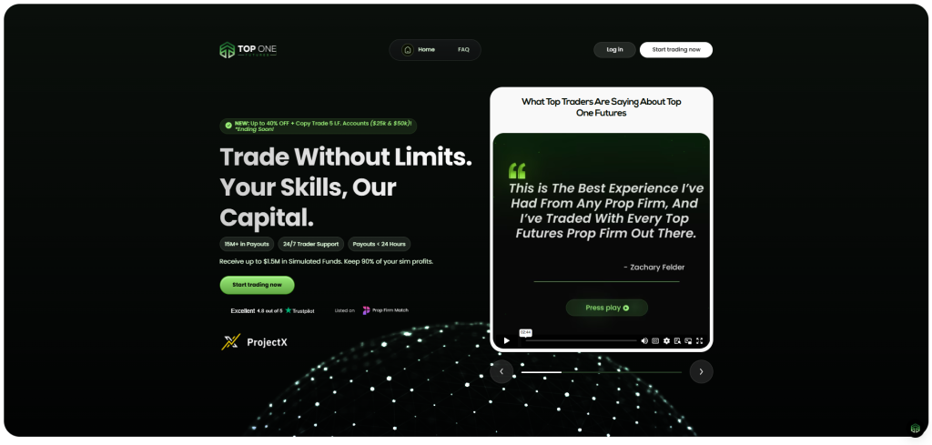 Top One Futures is a futures-only, simulation-based prop firm offering a 1-Step Elite Challenge and instant options (Instant Sim Funded and S2F Sim PRO). Standard sim payouts run every 10 active trading days via bank transfer processed through Plane.com, with risk rules such as a 2.5% daily loss limit and an end-of-day trailing drawdown that locks after set profit thresholds; trading is done on Project X (web) and Quantower (desktop).